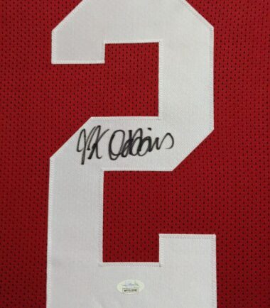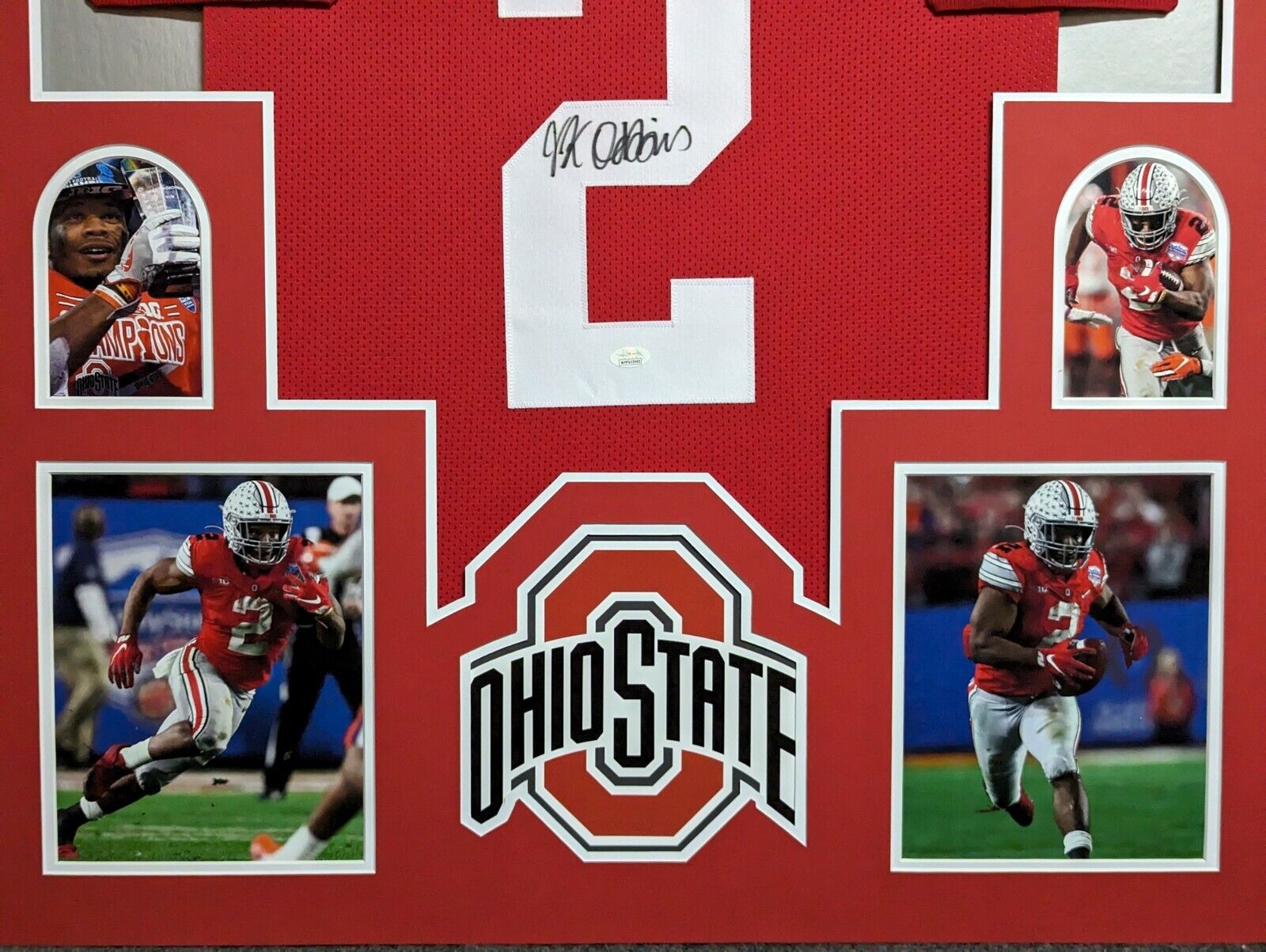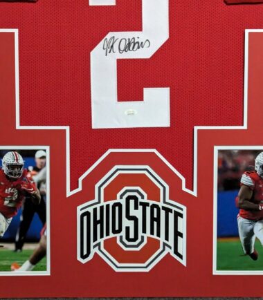Custom Framed JK Dobbins hand signed Ohio State Buckeyes style custom jersey.JSA Hologram and COAThe authentication is from JSA. This signature is authenticated by a representative of JSA! 100% AUTHENTIC!!!   The jersey has fully stitched numbers on the front and back.  It is a great item and a must for all great sports fans!This item is professionally framed, it measures 32”x40” inside , 42”x34” outside , using UV protective Acrylic glass for safe keeping and safe transport, team color matting, black moulding and hanging hooks on the back.  All additional items in frame seen in pictures included. 100% ready to hang in your fan cave.