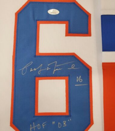 Custom Framed Pat LaFontaine hand signed inscribed “HOF “03” ” N.Y. Islanders custom jersey. JSA Hologram and COA(#WPP461397) The authentication is from JSA. This signature is not authenticated by opinion but it is WITNESSED by a representative of JSA! 100% AUTHENTIC!!! The jersey has fully stitched numbers on the front and back. It is a great item and a must for all great sports fans! This item is professionally framed, it measures 32”x40” inside , 42”x34” outside , using UV protective Acrylic glass for safe keeping and safe transport, team color matting, black moulding and hanging hooks on the back. All additional items in frame seen in pictures included. 100% ready to hang in your fan cave. Returns accepted if item is not as described or damaged and must be returned within 7 days of delivery to buyer. On Mar-04-18 at 18:56:15 PST, seller added the following information:ERROR IN LISTING. Item is not inscribed as noted. Item is the one you see in pictures, please see pics.