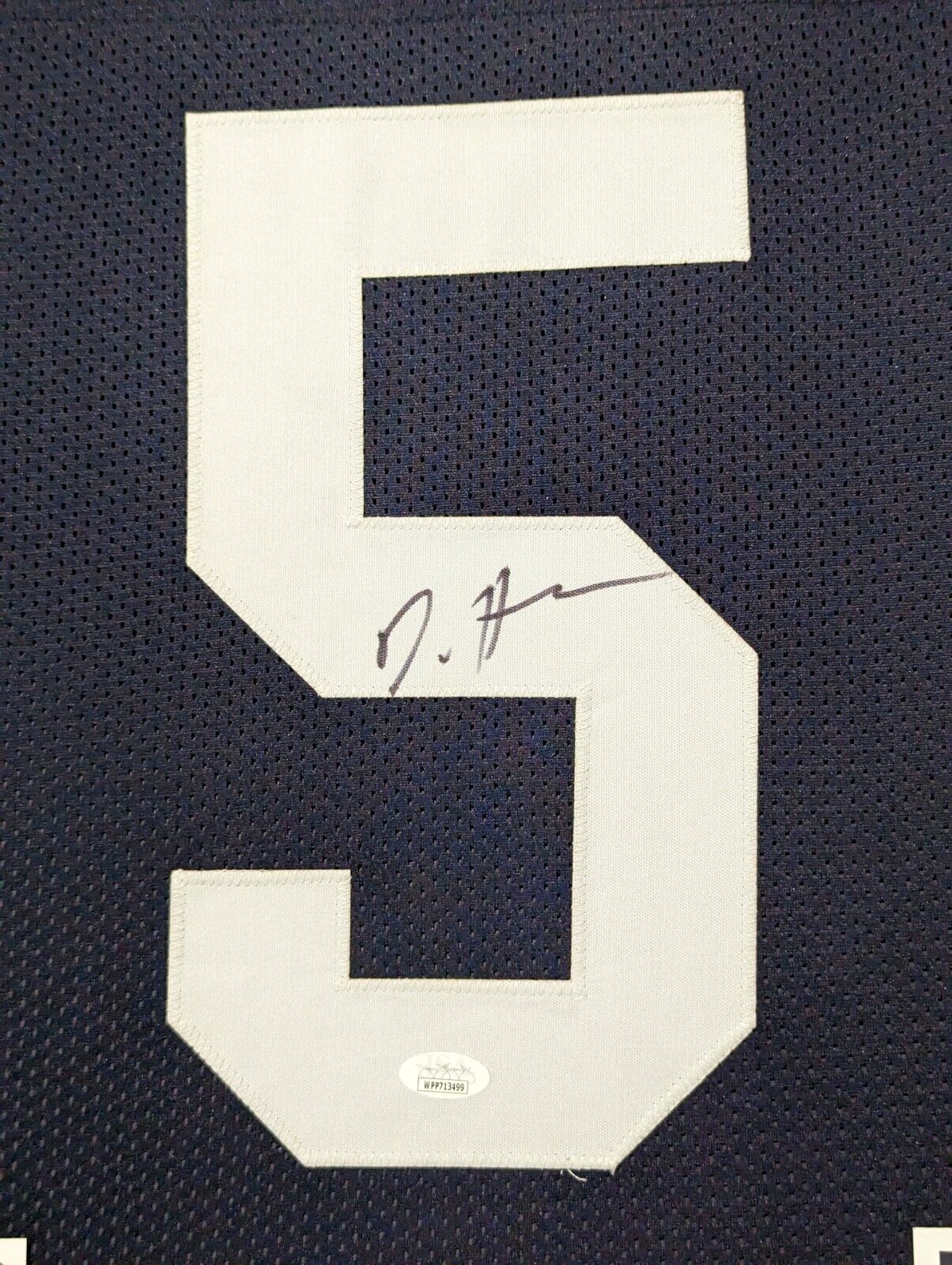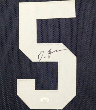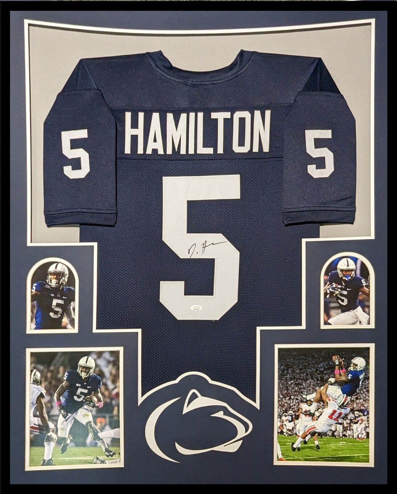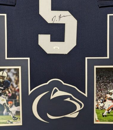 Custom Framed DaeSean Hamilton hand signed Penn State Nittany Lions style custom jersey. JSA COA – Stock image used The authentication is from JSA. This signature is authenticated by a representative of JSA! 100% AUTHENTIC!!!   The jersey has fully stitched numbers on the front and back.  It is a great item and a must for all great sports fans! This item is professionally framed, it measures 32”x40” inside , 42”x34” outside , using UV protective Acrylic glass for safe keeping and safe transport, team color matting, black moulding and hanging hooks on the back.  All additional items in frame seen in pictures included. 100% ready to hang in your fan cave.    Returns accepted if item is not as described or damaged and must be returned within 7 days of delivery to buyer.
