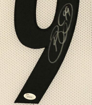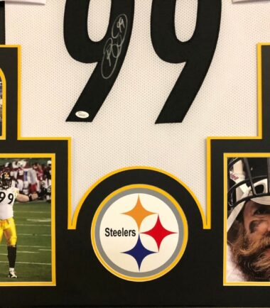 Custom Framed Brett Keisel hand signed Pittsburgh Steelers custom jersey.JSA Hologram and COA(#WP46306)The authentication is from JSA. This signature is not authenticated by opinion but it is WITNESSED by a representative of JSA! 100% AUTHENTIC!!! The jersey has fully stitched numbers on the front and back. It is a great item and a must for all great sports fans!This item is professionally framed, it measures 32”x40” inside , 42”x34” outside , using UV protective Acrylic glass for safe keeping and safe transport, team color matting, black moulding and hanging hooks on the back. All additional items in frame seen in pictures included. 100% ready to hang in your fan cave.