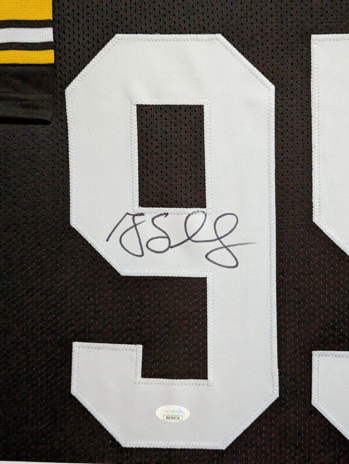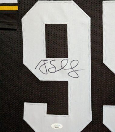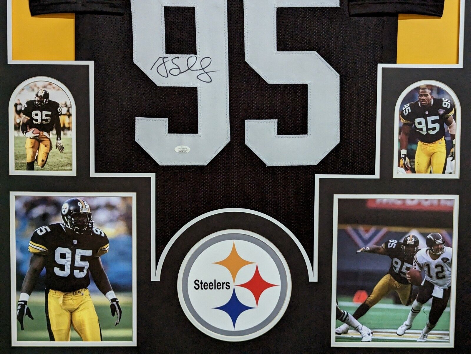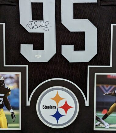 Custom Framed Greg Lloyd hand signed Pittsburgh Steelers style custom jersey.JSA Hologram and COAThe authentication is from JSA. This signature is WITNESSED by a representative of JSA! 100% AUTHENTIC!!! The jersey has fully stitched numbers on the front and back. It is a great item and a must for all great sports fans!This item is professionally framed, it measures 32”x40” inside , 42”x34” outside , using UV protective Acrylic glass for safe keeping and safe transport, team color matting, black moulding and hanging hooks on the back. All additional items in frame seen in pictures included. 100% ready to hang in your fan cave.