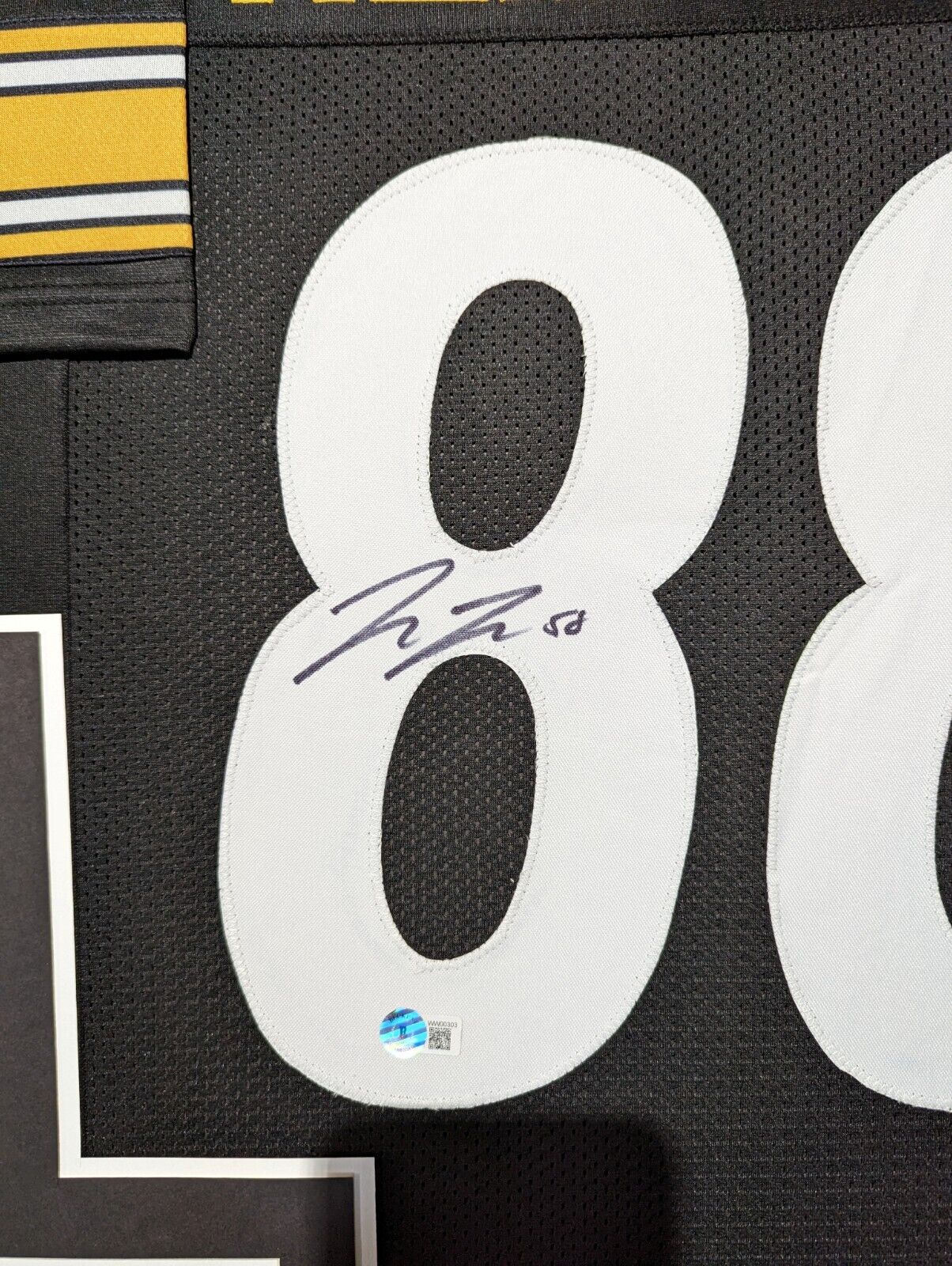 Custom Framed Pat Freiermuth hand signed Pittsburgh Steelers style custom jersey.Beckett HologramThe authentication is from BECKETT. This signature is WITNESSED by a representative of BECKETT! 100% AUTHENTIC!!! The jersey has fully stitched numbers on the front and back. It is a great item and a must for all great sports fans!This item is professionally framed, it measures 32”x40” inside , 42”x34” outside , using UV protective Acrylic glass for safe keeping and safe transport, team color matting, black moulding and hanging hooks on the back. All additional items in frame seen in pictures included. 100% ready to hang in your fan cave.