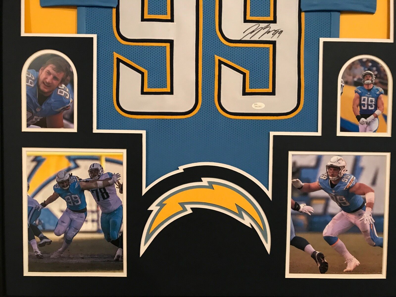 Custom Framed Joey Bosa hand signed San Diego Chargers jersey.PSA Hologram and COA(#WP615851)The authentication is from JSA. This signature is not authenticated by opinion but it is WITNESSED by a representative of JSA! 100% AUTHENTIC!!! The jersey has fully stitched numbers on the front and back. It is a great item and a must for all great sports fans!This item is professionally framed, it measures 32”x40” inside , 42”x34” outside , using UV protective Acrylic glass for safe keeping and safe transport, team color matting, black moulding and hanging hooks on the back. All additional items in frame seen in pictures included. 100% ready to hang in your fan cave.