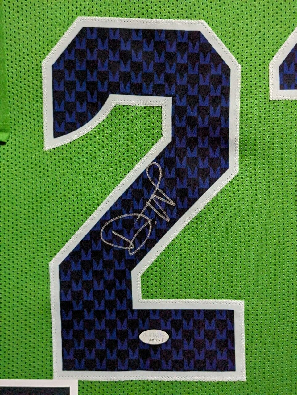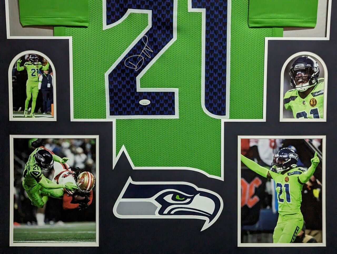 Custom Framed Devon Witherspoon hand signed Seattle Seahawks style custom jersey.JSA Hologram and COAThe authentication is from JSA. This signature is WITNESSED by a representative of JSA! 100% AUTHENTIC!!! The jersey has fully stitched numbers on the front and back. It is a great item and a must for all great sports fans!Stock photos are used for auctions. Will receive equal quality.This item is professionally framed, it measures 32”x40” inside , 42”x34” outside , using UV protective Acrylic glass for safe keeping and safe transport, team color matting, black moulding and hanging hooks on the back. All additional items in frame seen in pictures included. 100% ready to hang in your fan cave. Shipping and handling is $49.99 to domestic United States using FedEx ground. All international shipping is made through Ebay global shipping. 6% sales tax applies to PA residents. We ship multiple times a week and your item will ship within 3 days of purchase. Local pick up is accepted. Returns accepted if item is not as described or damaged and must be returned within 7 days of delivery to buyer. All payments accepted through Paypal and are expected within 3 days of purchase. I aim to make every transaction smooth and will leave feedback, please do so in return. I will combine shipping where possible, so please wait for invoice on multiple purchases. Any questions please ask!! Thank you for looking!!! If you like the framing, feel free to ask how you can have your personal items framed. We also have wholesale pricing for dealers.