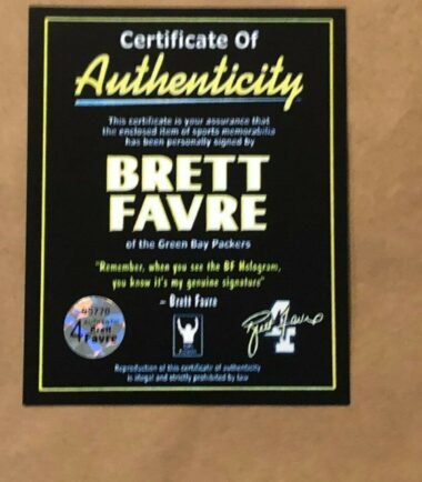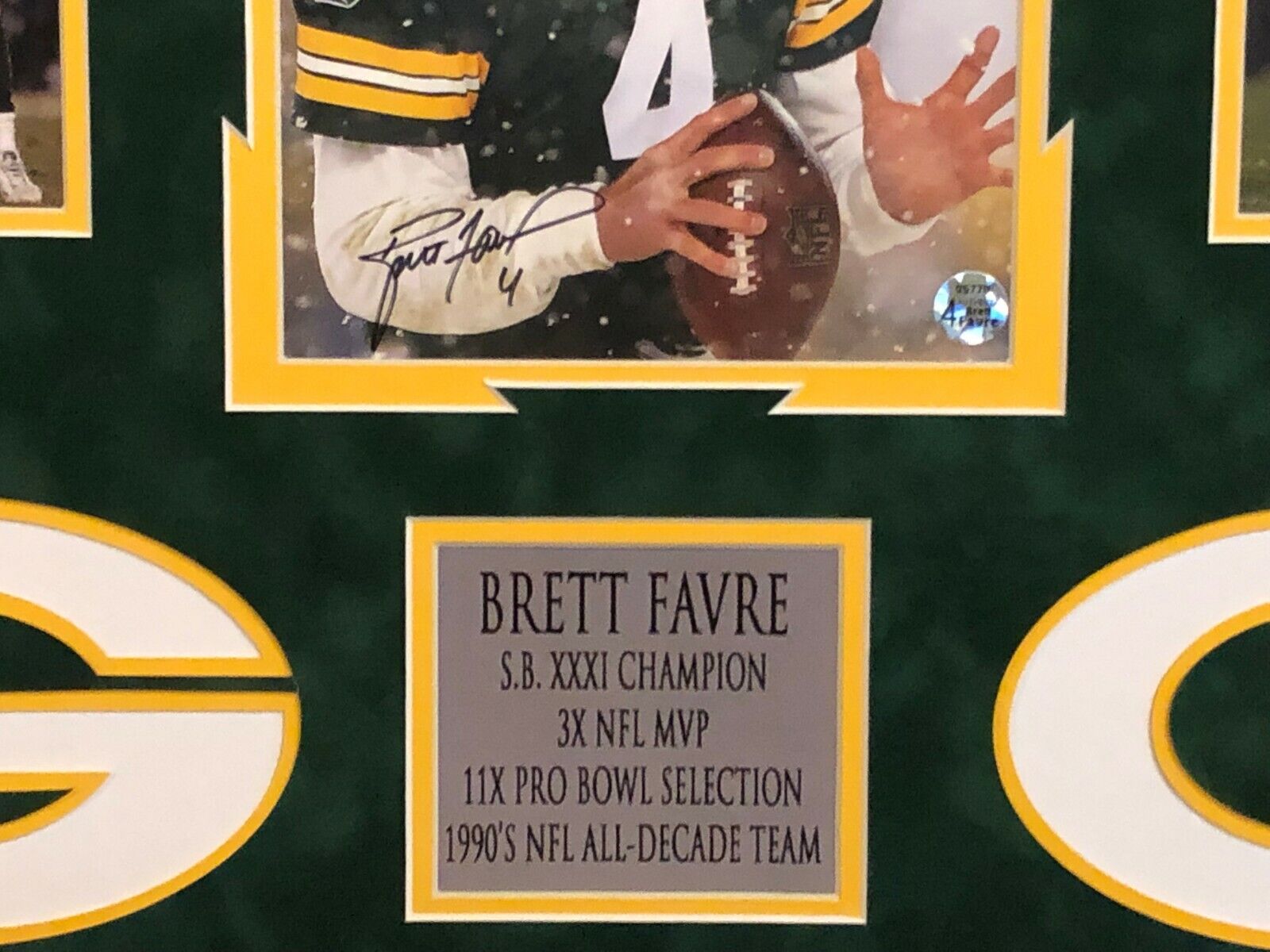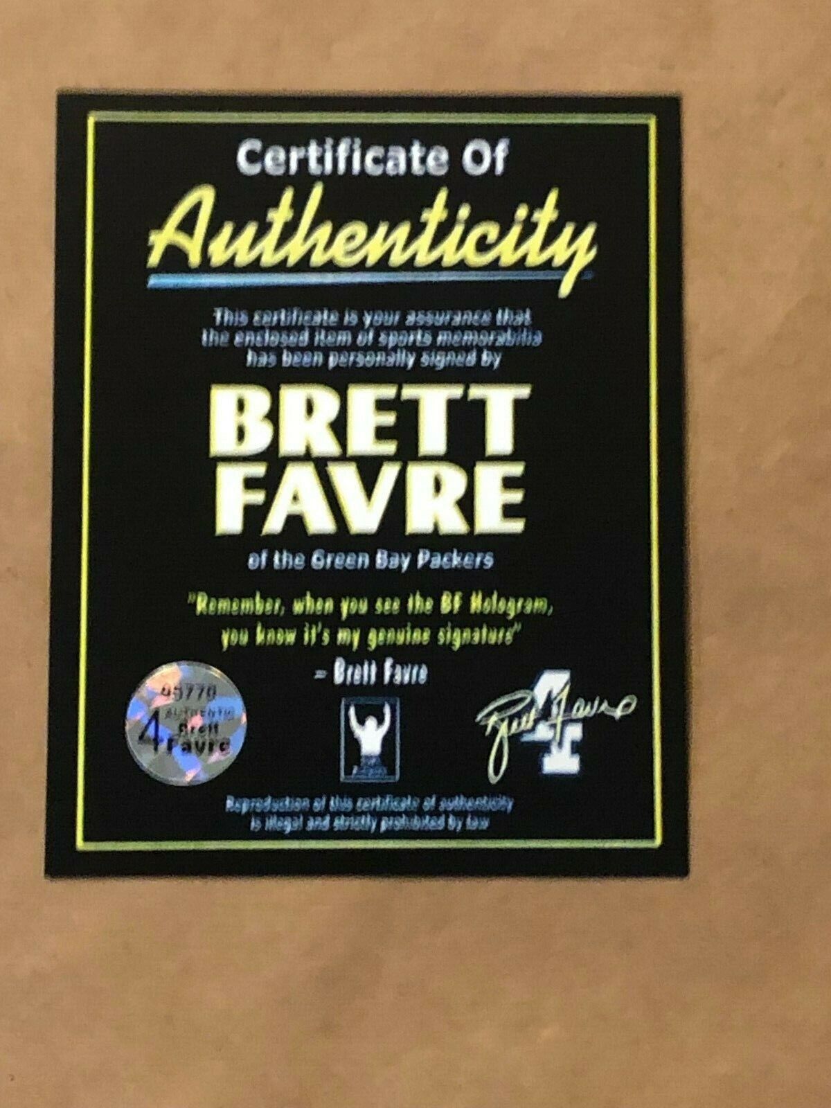 Custom Framed Brett Favre hand signed 8×10.Favre Hologram and COAThe authentication is from Favre. This signature is authenticated by a representative of Favre! 100% AUTHENTIC!!! It is a great item and a must for all great sports fans!This item is professionally framed, using team color SUEDE matting, black moulding and hanging hooks on the back. All additional items in frame seen in pictures included. 100% ready to hang in your fan cave.
