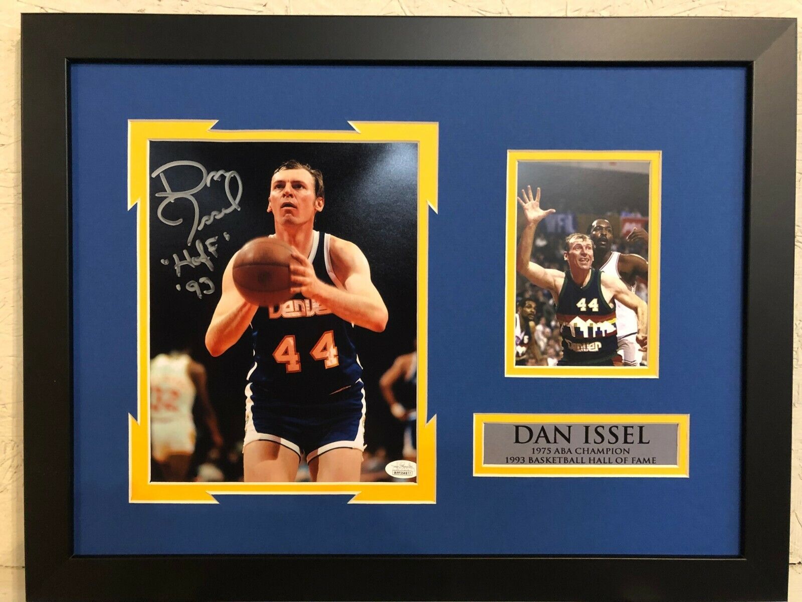 Custom Framed Dan Issel hand signed inscribed “HOF 93” 8×10.JSA HOLOGRAM and COA(#WPP354877) The authentication is from JSA. This signature is not authenticated by opinion, but is WITNESSED by a representative of JSA! 100% AUTHENTIC!!! It is a great item and a must for all great sports fans!This item is professionally framed, using team color matting, black moulding and hanging hooks on the back. All additional items in frame seen in pictures included. 100% ready to hang in your fan cave. LIke the framing, feel free to ask how to have your items framed.