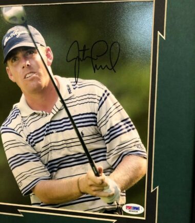 Custom Framed Justin Leonard hand signed 8×10.PSA HOLOGRAM and COA(#M54836) The authentication is from PSA. This signature is authenticated a representative of PSA! 100% AUTHENTIC!!! It is a great item and a must for all great sports fans!This item is professionally framed, using team color matting, black moulding and hanging hooks on the back. All additional items in frame seen in pictures included. 100% ready to hang in your fan cave. LIke the framing, feel free to ask how to have your items framed.