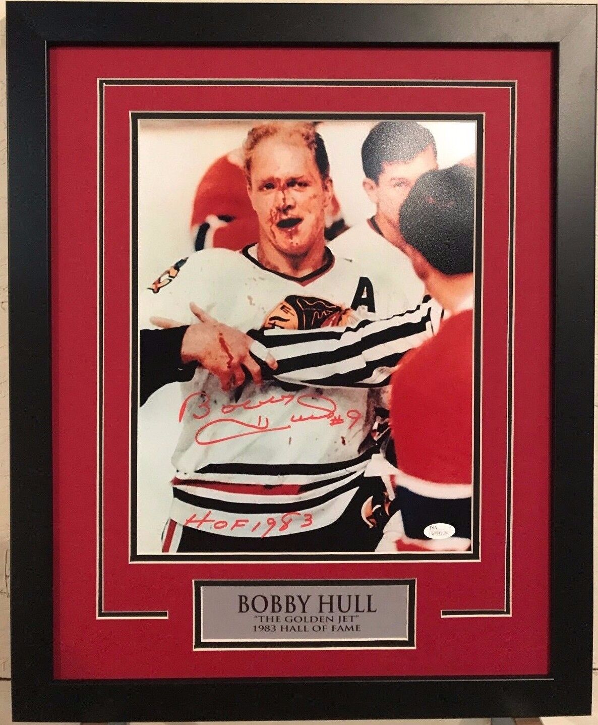 Custom Framed Bobby Hull Chicago Blackhawks signed inscribed “HOF 1983” 11×14.JSA HOLOGRAM and COA(#WP541124) The authentication is from JSA. This signature is authenticated by a representative of JSA! 100% AUTHENTIC!!!   It is a great item and a must for all great sports fans!This item is professionally framed, using team color matting, black moulding and hanging hooks on the back.  All additional items in frame seen in pictures included. 100% ready to hang in your fan cave.