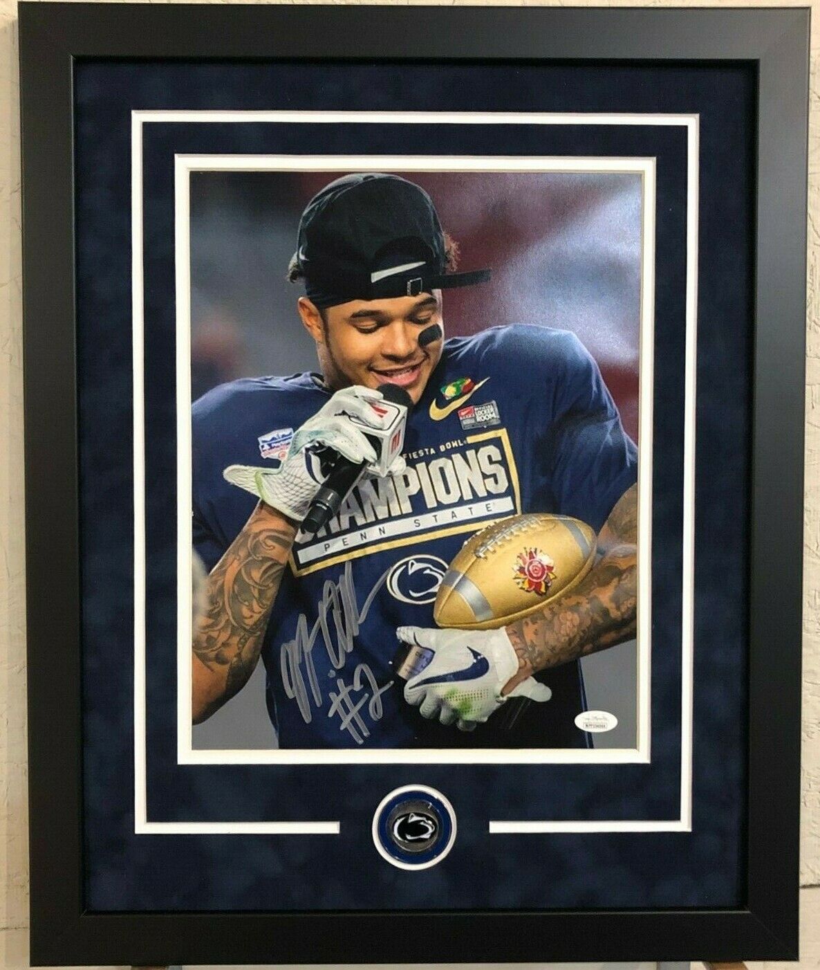 Custom Framed Marcus Allen hand signed Penn State 11×14.JSA HOLOGRAM and COA(#WPP354066) The authentication is from JSA. This signature is authenticated by a representative of JSA! 100% AUTHENTIC!!! It is a great item and a must for all great sports fans!This item is professionally framed, using team color SUEDE matting, black moulding and hanging hooks on the back. All additional items in frame seen in pictures included. 100% ready to hang in your fan cave.