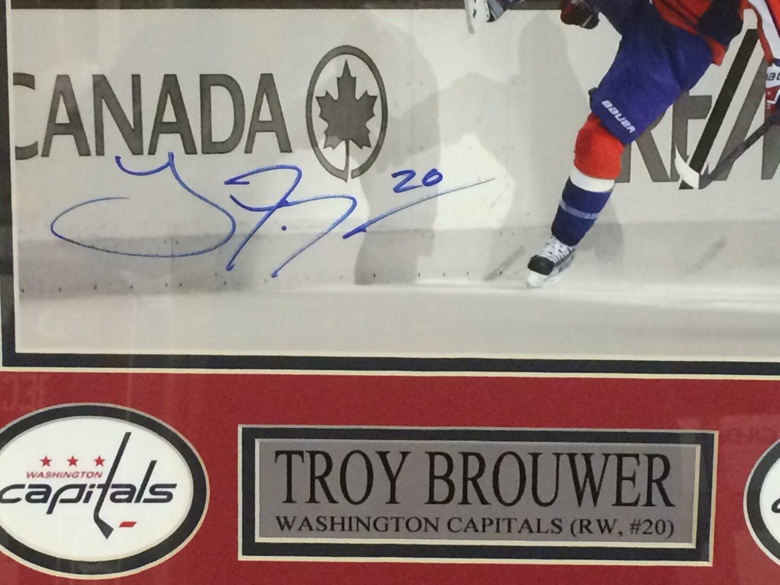 Custom Framed Troy Brouwer hand signed Troy Brouwer 11×14. 100% AUTHENTIC!!! Authenticator was unable to make signing due to snow storm, so the item will include a picture of Troy at the signing. It is a great item and a must for all great sports fans!This item is professionally framed, using glass , team color matting, black moulding and hanging hooks on the back. All additional items in frame seen in pictures included. 100% ready to hang in your fan cave.