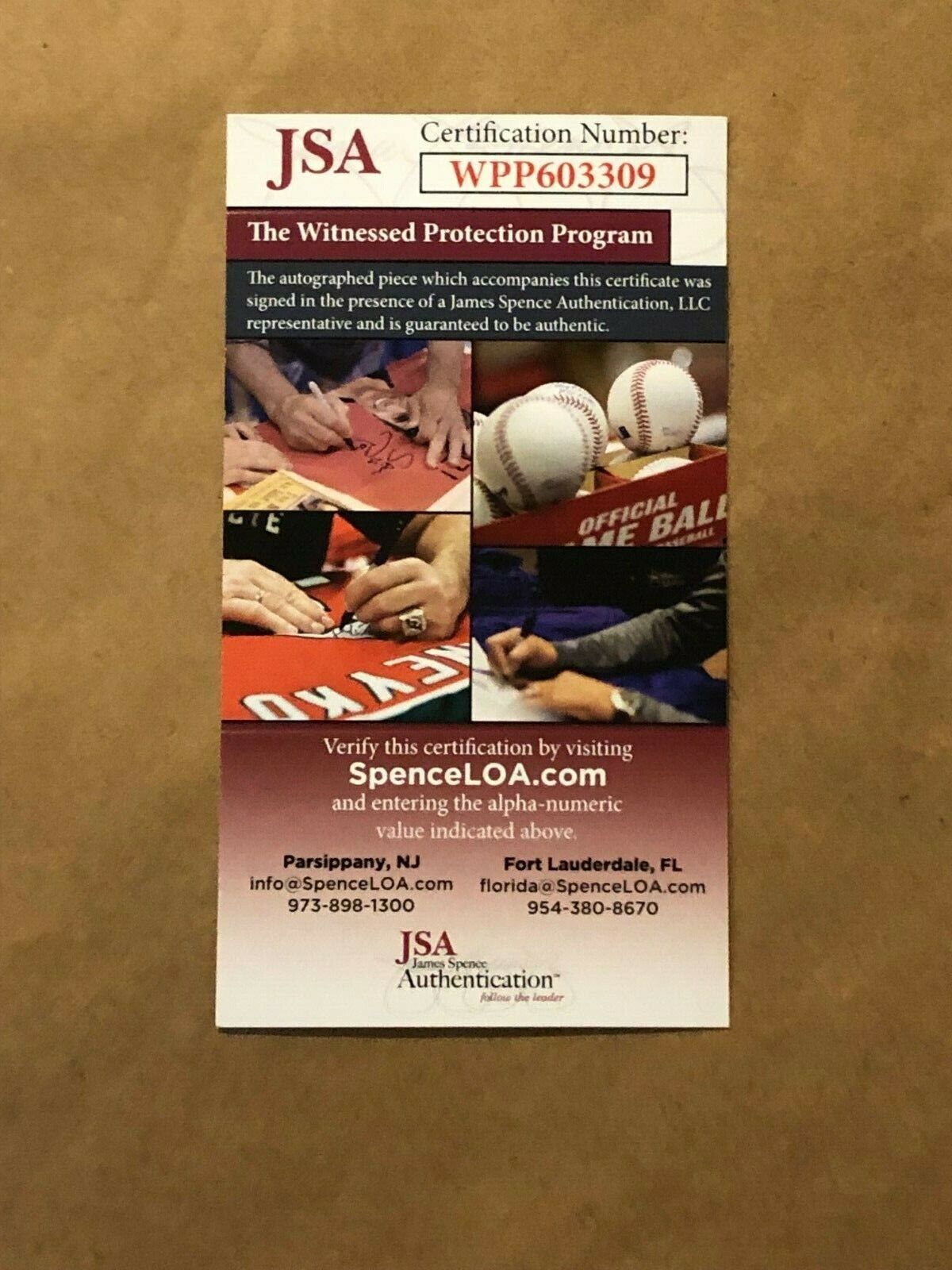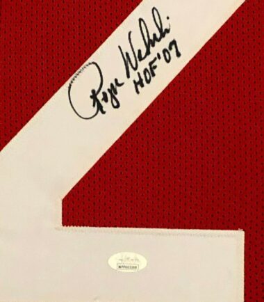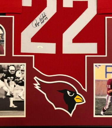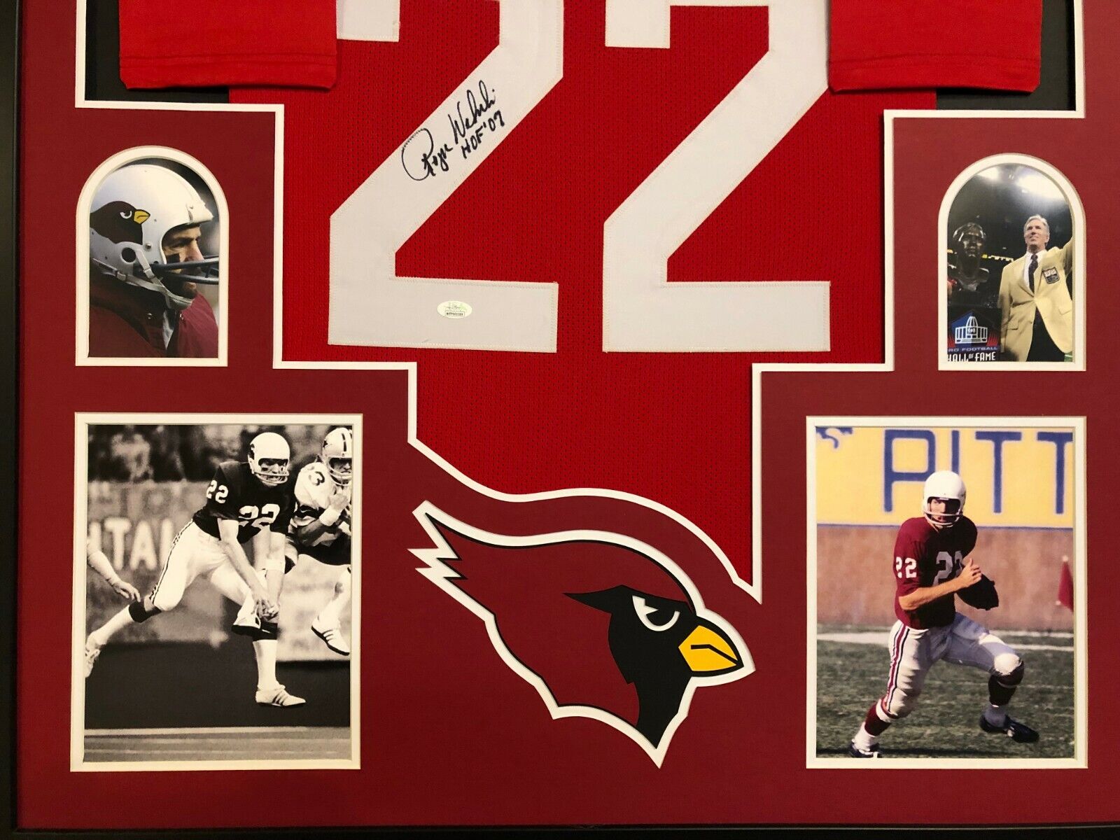 Framed Roger Wehrli hand signed inscribed “HOF 07” St. Louis Cardinals jersey.JSA Hologram and COA (#WPP603309)The authentication is from JSA. This signature is authenticated by a representative of JSA! 100% AUTHENTIC!!! The jersey has fully stitched numbers on the front and back. No tags or logos. This is not an official NFL jersey but it is very high quality. It is a great item and a must for all great sports fans!This item is professionally framed, it measures 32”x40” inside , 42”x34” outside , using UV protective Acrylic glass for safe keeping and safe transport, team color matting, black moulding and hanging hooks on the back. All additional items in frame seen in pictures included. 100% ready to hang in your fan cave.