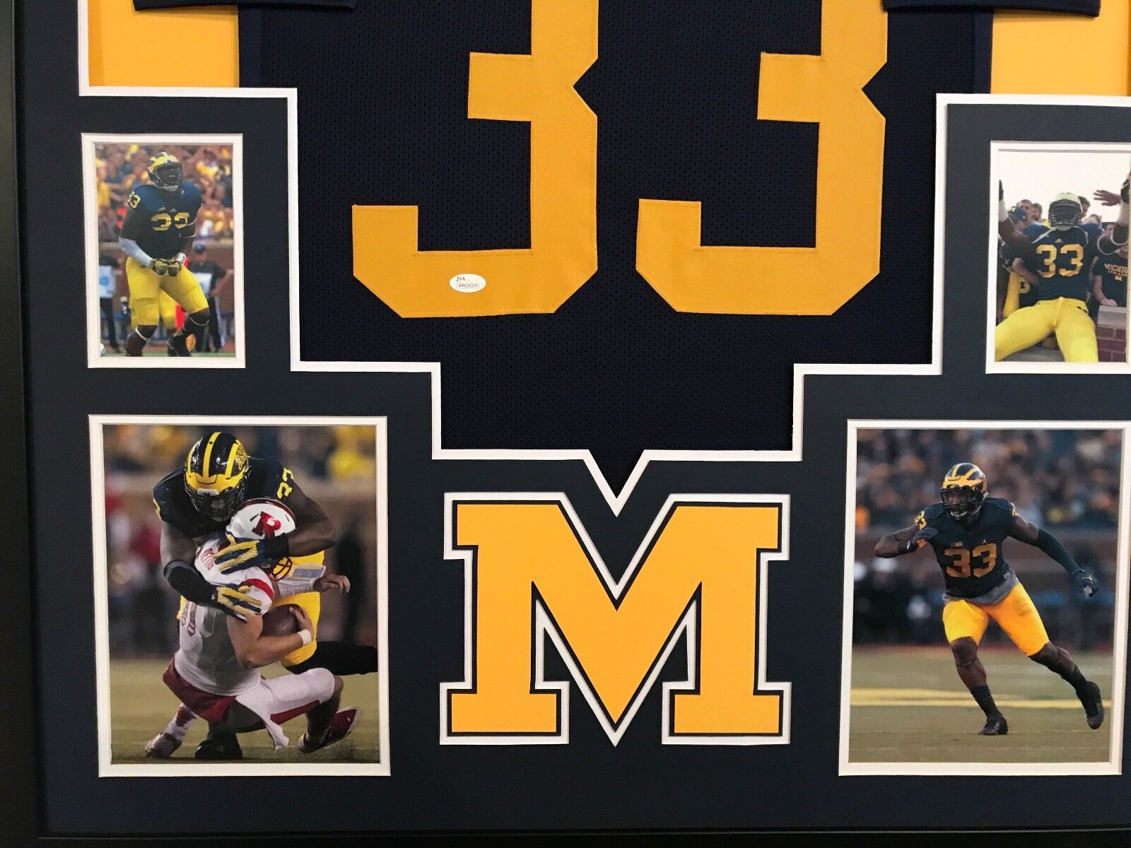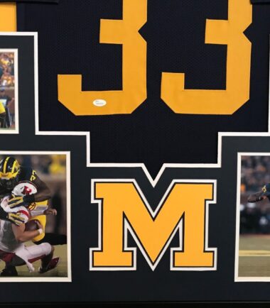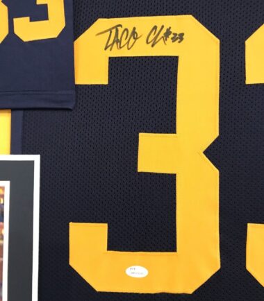 Custom Framed Taco Charlton hand signed Michigan Wolverines jersey.JSA Hologram and COA(#WP620224)The authentication is from JSA. This signature is authenticated by a representative of JSA! 100% AUTHENTIC!!! The jersey has fully stitched numbers on the front and back. It is a great item and a must for all great sports fans!This item is professionally framed, it measures 32”x40” inside , 42”x34” outside , using UV protective Acrylic glass for safe keeping and safe transport, team color matting, black moulding and hanging hooks on the back. All additional items in frame seen in pictures included. 100% ready to hang in your fan cave.