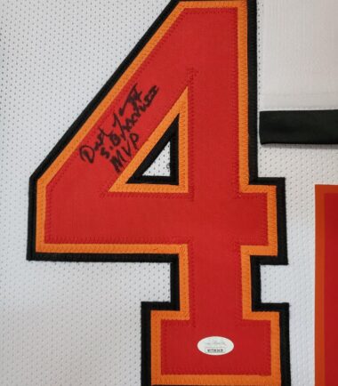 Custom Framed Dexter Jackson hand signed, “S.B. XXXVII MVP” Inscribed Tampa Bay Buccaneers style custom jersey.JSA Hologram and COAThe authentication is from JSA. 100% AUTHENTIC!!! The jersey has fully stitched numbers on the front and back. It is a great item and a must for all great sports fans!Stock photos are used for auctions. Will receive equal quality.This item is professionally framed, it measures 32”x40” inside , 42”x34” outside , using UV protective Acrylic glass for safe keeping and safe transport, team color matting, black moulding and hanging hooks on the back. All additional items in frame seen in pictures included. 100% ready to hang in your fan cave.