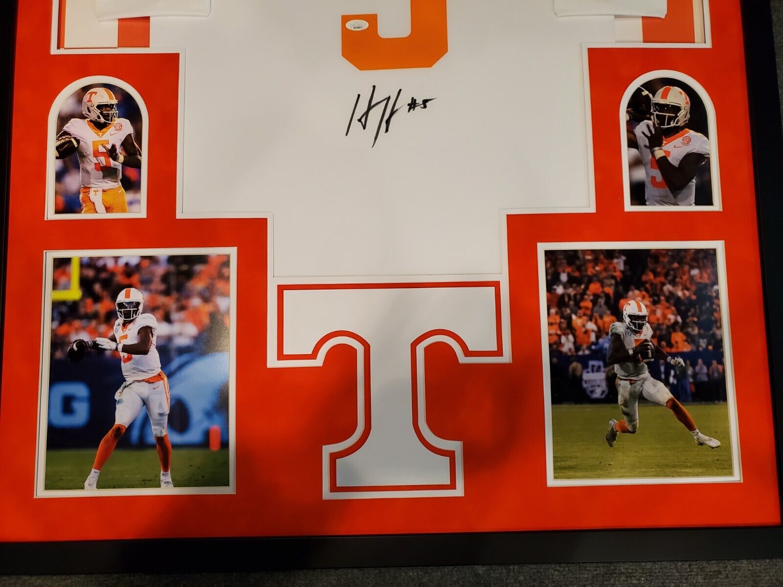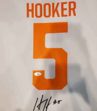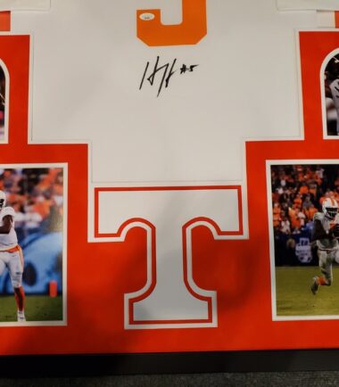 Custom Framed Hendon Hooker hand signed Tennessee Volunteers authentic jerseyJSA Hologram and COA (#SD196973)The authentication is from JSA. This signature is authenticated by a representative of JSA! 100% AUTHENTIC!!! The jersey has fully stitched numbers on the front and back. It is a great item and a must for all great sports fans!This item is professionally framed, it measures 32”x40” inside , 42”x34” outside , using UV protective Acrylic glass for safe keeping and safe transport, team color matting, black moulding and hanging hooks on the back. All additional items in frame seen in pictures included. 100% ready to hang in your fan cave.