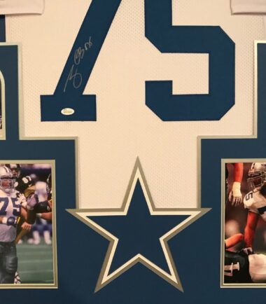 Custom Framed Tony Casillas hand signed Dallas Cowboys jersey.JSA Hologram and COA(#WPP029814)The authentication is from JSA. This signature is not authenticated by opinion but it is WITNESSED by a representative of JSA! 100% AUTHENTIC!!!   The jersey has fully stitched numbers on the front and back.  It is a great item and a must for all great sports fans!This item is professionally framed, it measures 32”x40” inside , 42”x34” outside , using UV protective Acrylic glass for safe keeping and safe transport, team color matting, black moulding and hanging hooks on the back.  All additional items in frame seen in pictures included. 100% ready to hang in your fan cave.