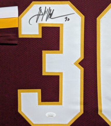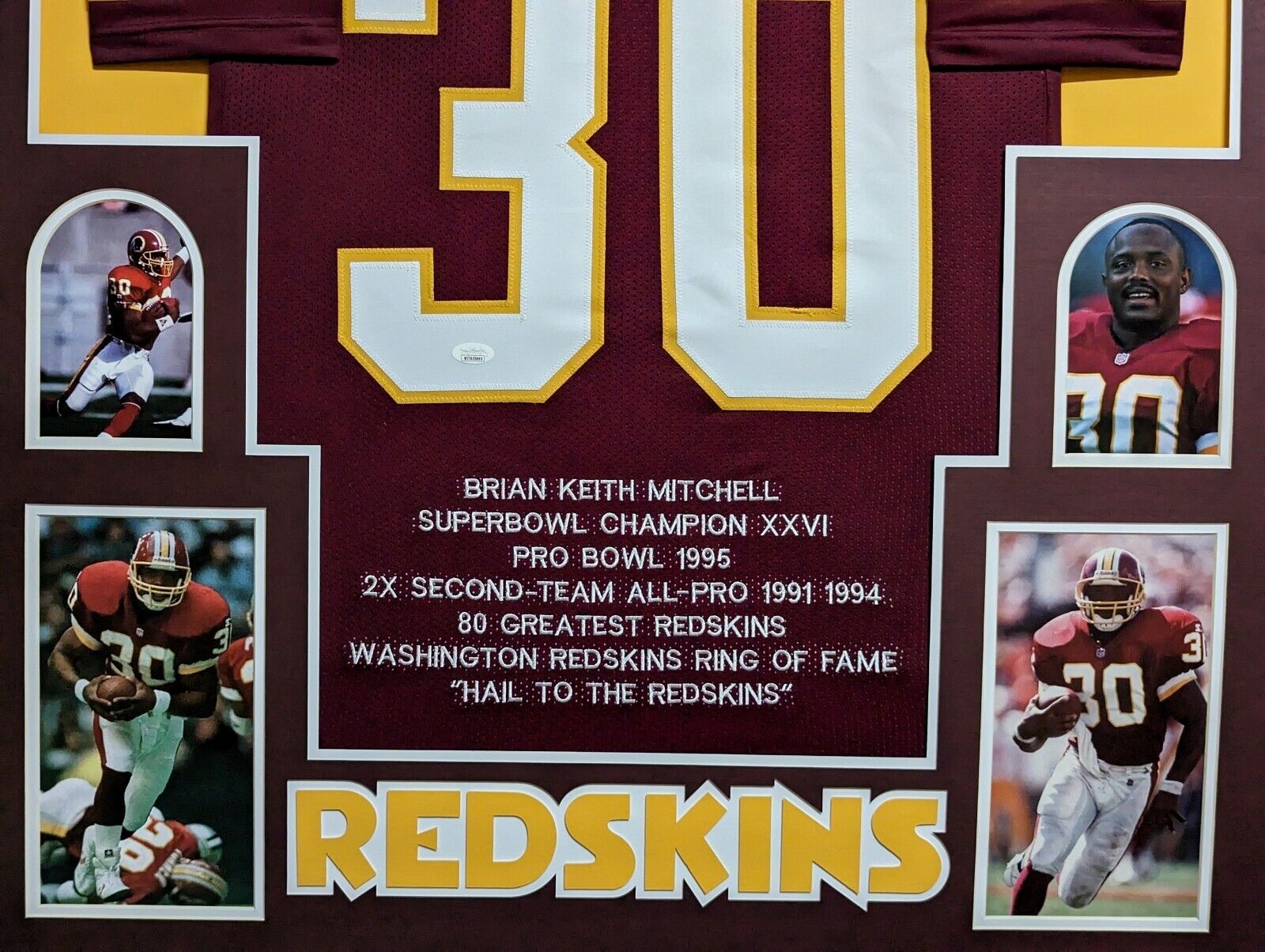 Custom Framed Brian Mitchell hand signed Washington football style custom stat jersey.JSA COAThe authentication is from JSA. This signature is WITNESSED by a representative of JSA! 100% AUTHENTIC!!! The jersey has fully stitched numbers on the front and back. This item is professionally framed, it measures 32”x40” inside , 42”x34” outside , using UV protective Acrylic glass for safe keeping and safe transport, team color matting, black moulding and hanging hooks on the back. All additional items in frame seen in pictures included. 100% ready to hang in your fan cave.