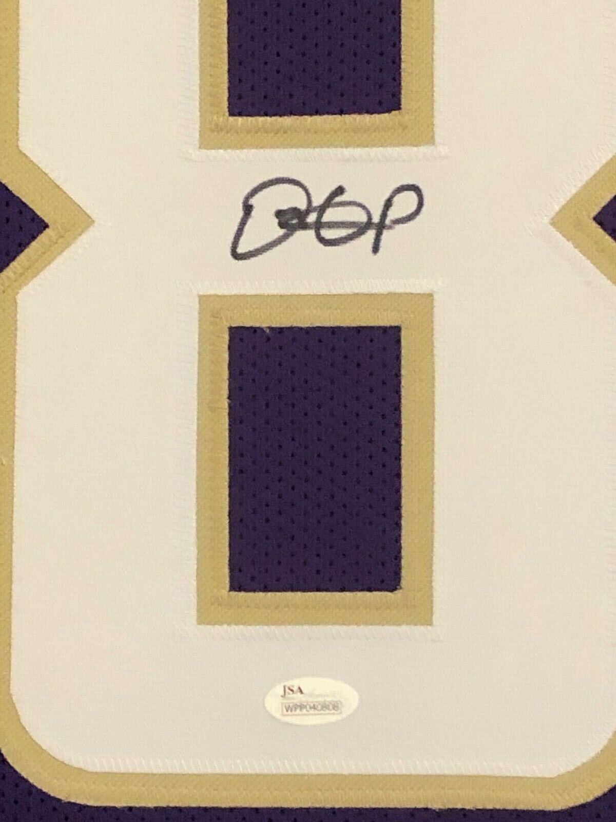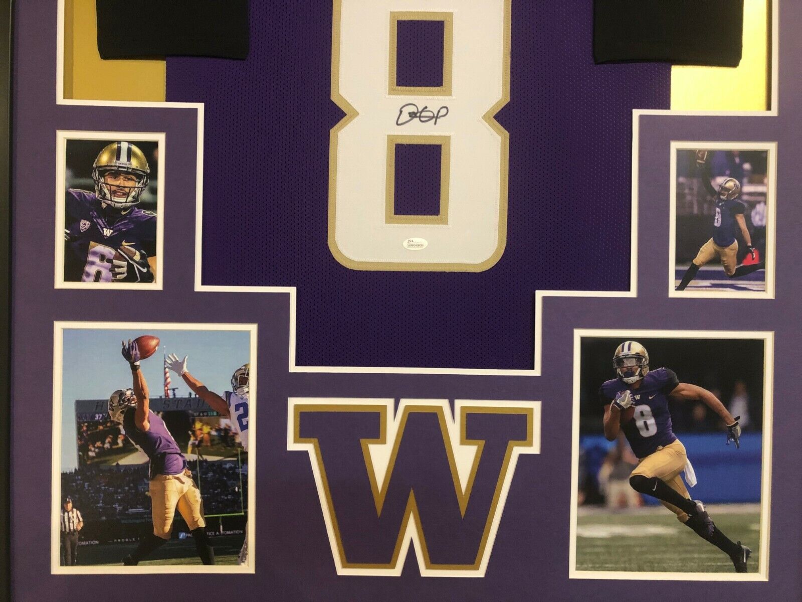 Custom Framed Dante Pettis hand signed Washington Huskies jersey.JSA Hologram and COA(#WPP040808)The authentication is from JSA. This signature is authenticated by a representative of JSA! 100% AUTHENTIC!!!   The jersey has fully stitched numbers on the front and back.  It is a great item and a must for all great sports fans!This item is professionally framed, it measures 32”x40” inside , 42”x34” outside , using UV protective Acrylic glass for safe keeping and safe transport, team color matting, black moulding and hanging hooks on the back.  All additional items in frame seen in pictures included. 100% ready to hang in your fan cave.