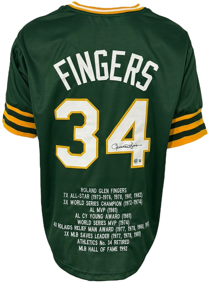 Oakland A’s Rollie Fingers Autographed Pro Style Green Stat Jersey BAS Authenticated