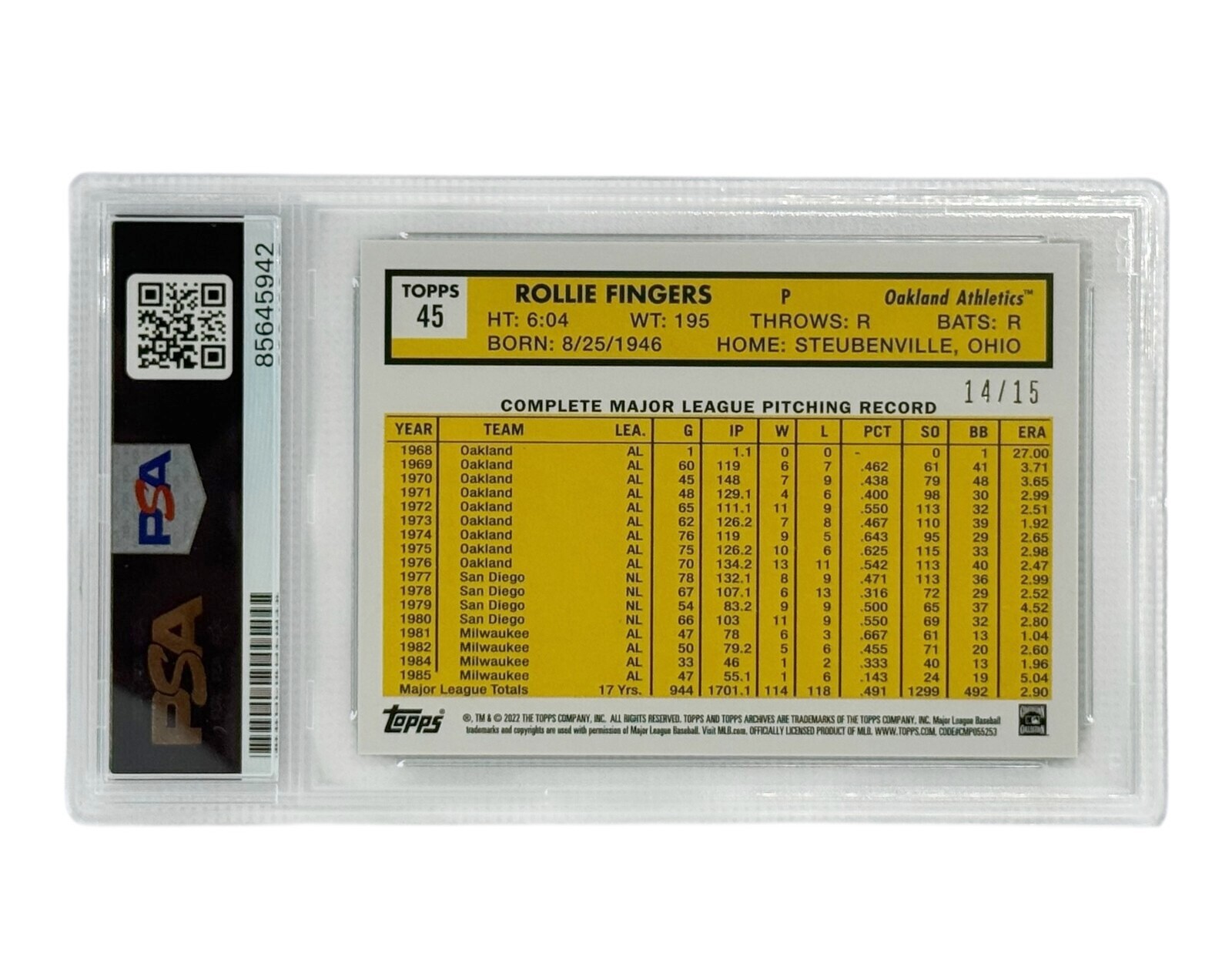 Rollie Fingers Autographed 2022 Topps #45 PSA Authenticated