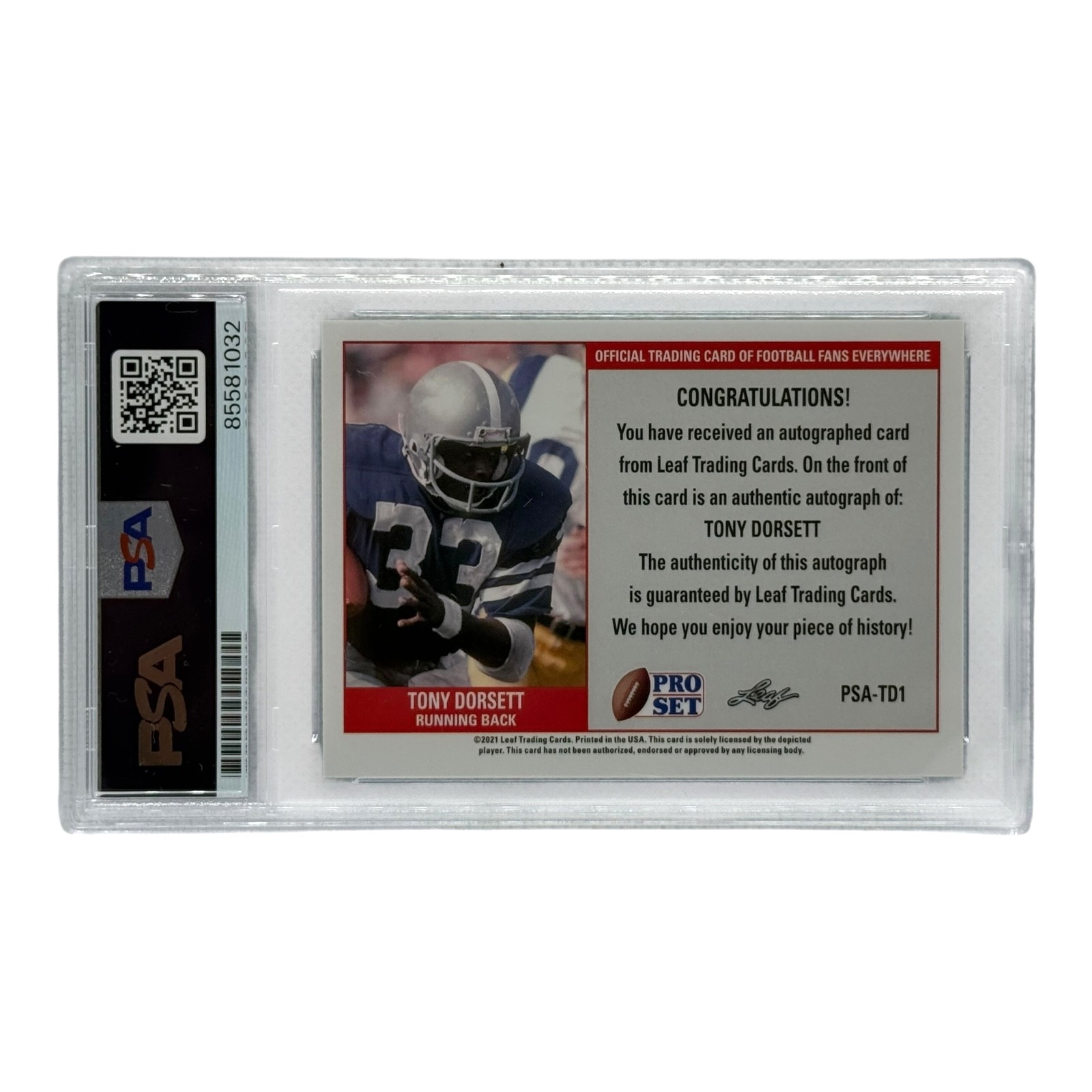 Tony Dorsett Autographed 2021 Leaf Pro Set PSA Authenticated